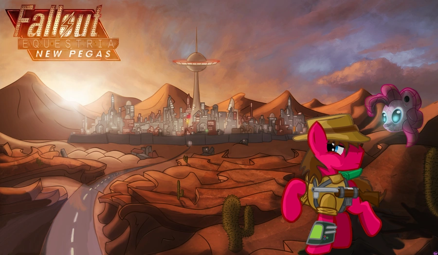 Calbeck considers most elements of Fallout: Equestria, Project Horizons and Pink Eyes to be canon to New Pegas, making references to all three at various points. One example is a game of Caravan with mystical overtones, wherein references are made to the protagonists and villains of those stories during the course of the game. He and A Friendly Hobo have also agreed that New Pegas and Tales of a Courier are mutually canonical, with the Moohave Desert becoming the Ponave far to the northwest of New Pegas. This is similar to the way that various deserts in the American Southwest border and overlap one another.