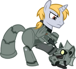 Inkwell wears a standard suit of magical Power armour, his helmet has a hole drilled in it for his horn. Inkwell also wears a metal saddlebag. with rails on the side to mount heavy weapons. The saddlebag also includes an ammo-feeder that feeds ammo into Inkwells weapons.