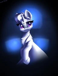Professor Zodiac is a white unicorn mare with gray zebra-like stripes on her legs and mane.