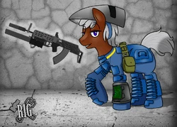 Rig is a protagonist of the story Fallout: Equestria - The Last Sentinel. She currently travels with Frost Windchill and Azrael Razorwing on her mission for her Stable, starting forty years before the events of "Fallout: Equestria".